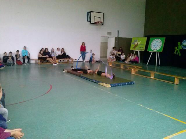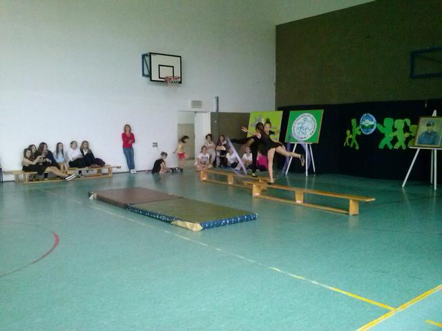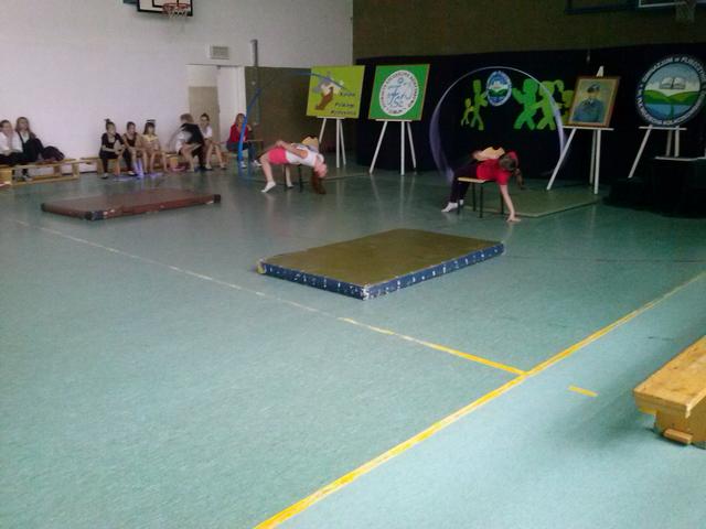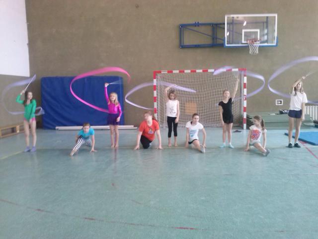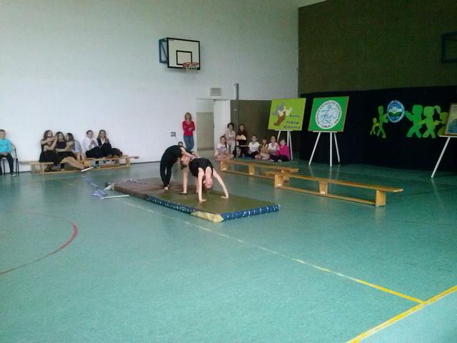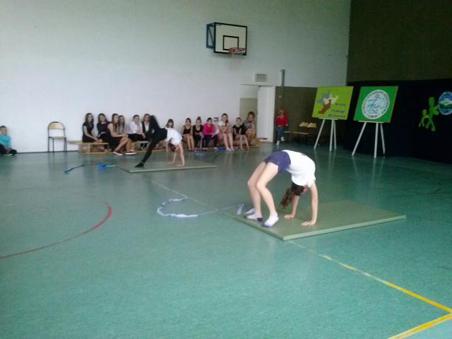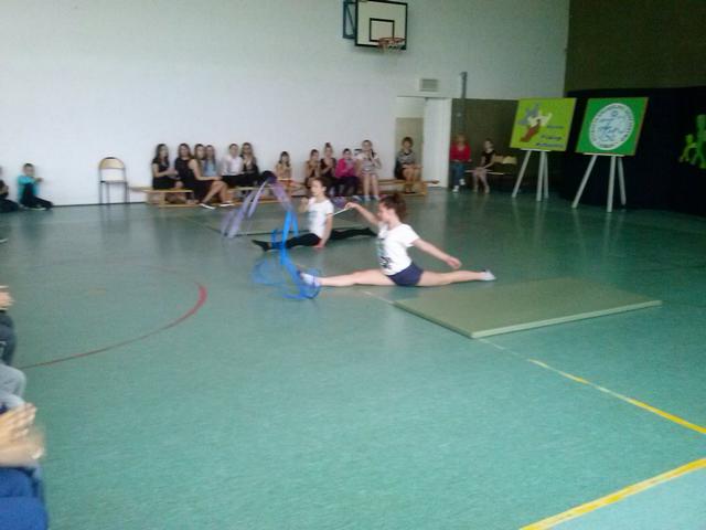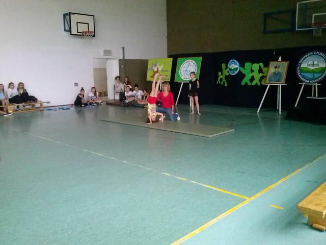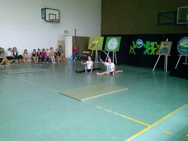 Z okazji Dnia Dziecka uczennice klas IV-VI zaprezentowały układy ćwiczeń z elementami gimnastyki artystycznej. Wykorzystały w nich nabyte przez siebie umiejętnośći posługiwania się wstążką w połączeniu z różnymi przyrządami takimi jak: ławeczka czy proste krzesło. Układy były bardzo ciekawe i zawierały trudne elementy gimnastyczne takie jak: przewroty w przód i w tył, stanie na rękach, mostek czy szpagat. Dziewczęta zostały nagrodzone dużymi brawami przez wszystkich uczniów zgromadzonych na pokazach. Zapraszamy wszystkich, którzy chcą się zmierzyć z tą trudną dyscypliną sportową na zajęcia w nowym roku szkolnym:)
