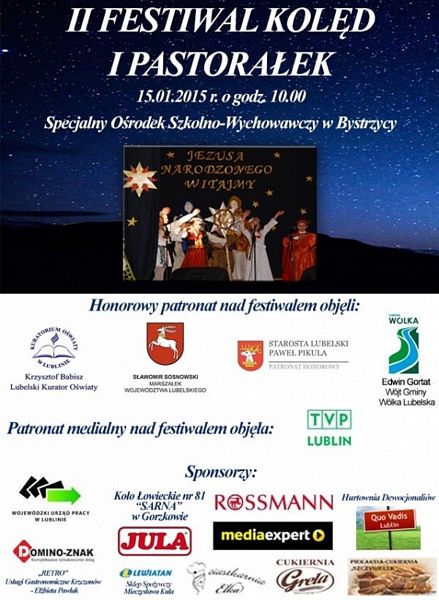 15 I 2015 roku odbyła się kolejna edycja festiwalu, na którym naszą szkołę reprezentował zespół wokalny „Pliszczynek” (w składzie :Klaudia Ponikiewska, Deborah Basso, Jagoda Buczek, Klara Brańska, Remigiusz Podstawka, Klaudia Bicz). W kategorii solistów wystąpiła Klara Brańska, która zdobyła wyróżnienie . Impreza odbyła się pod hasłem 'Jezusa Narodzonego witajmy'. Podczas przesłuchania każdy z wykonawców prezentował jedną kolędę lub pastorałkę, z akompaniamentem lub podkładem muzycznym. Gościem specjalnym wydarzenia był Dariusz Tokarzewski z zespołu Vox, który jednocześnie przewodniczył w jury konkursowym. Festiwal organizowany był w Specjalnym Ośrodku Szkolno-Wychowawczym w Bystrzycy. W konkursie wokalnym wzięło udział ponad 140 uczniów szkół podstawowych, gimnazjów i kilku specjalnych ośrodków szkolno-wychowawczych. Patronat medialny objęła TVP Lublin. (video relacja http://lublin.tvp.pl/18454034/ii-festiwal-koled-i-pastoralek)