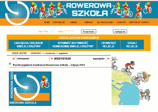 Nasza szkoła wzięła udział w ogólnopolskim konkursie projektu Rowerowa Szkoła. Przedmiotem konkursu są działania na rzecz popularyzacji komunikacji rowerowej oraz tworzenia szkoły przyjaznej rowerzyście, w szczególności wszelkie formy aktywności realizowane w ramach oferty projektu edukacyjnego Rowerowa Szkoła lub inne o podobnym celu i charakterze. W edycji 2014 wzięło udział 229 placówek szkolnych. Wysłaliśmy kilka relacji z naszych wycieczek rowerowych, organizowanych przez szkolny klub regionalno – turystyczny i zajęliśmy trzynaste miejsce. Z wysłanych na konkurs relacji, jury konkursu „dowiedziało się″, że rowerem można odkrywać najbliższą okolicę, jej walory przyrodnicze, historię, tajemnice, ciekawostki i spotykać ciekawych ludzi.