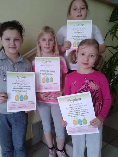 Święta tuż,tuż...Z tej okazji, dzieci uczęszczające do naszej świetlicy wzięły udział w międzyszkolnym konkursie na najciekawszą kartkę wielkanocną, organizowanym przez SP w Sobianowicach. Nie obyło się bez nagród. I miejsce w kategorii kl. II-III zdobyła Małgosia Machaj. Wyróżnienia otrzymali: Maja Piotrowicz kl.I, Hanna Drżał kl.0, oraz Otylia Urban kl.III.Wszystkim serdecznie gratulujemy!I życzymy z okazji Wielkiej Nocy kolorowych jajeczek, rozczochranych owieczek, kicających króliczków, pyszności w koszyczku! I koniecznie mokrego ubrania w dzień wielkiego lania!!!