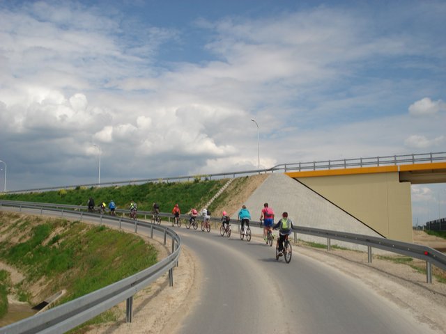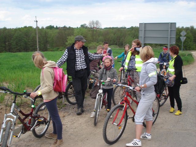 Ostatni odcinek trasy przez Jakubowice Konińskie wzdłuż rzeki Ciemięgi pokonaliśmy bardzo szybko, chociaż było wiele stromych podjazdów i zjazdów. Mogliśmy podziwiać Dolinę Ciemięgi wiosną, wybarwioną różnymi soczystymi odcieniami zieleni. Dojechaliśmy do nowego ronda i tu pani Jola sprawdziła wiadomości, dotyczące zachowania rowerzysty na skrzyżowaniu. Od przejazdu po rondzie rozpoczęliśmy drogę powrotną, nową szosą tzw. „serwisówką”, wybudowaną wzdłuż obwodnicy Lublina. Liczne podjazdy i strome zjazdy po dobrej drodze sprawiły, że powrót był sprawny i ciekawy.