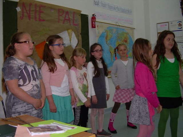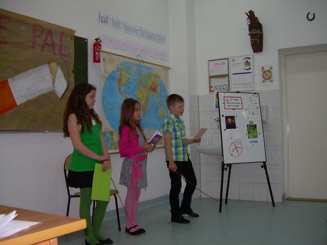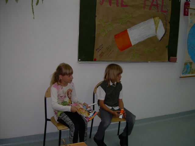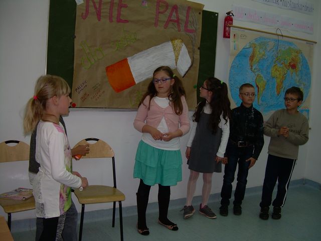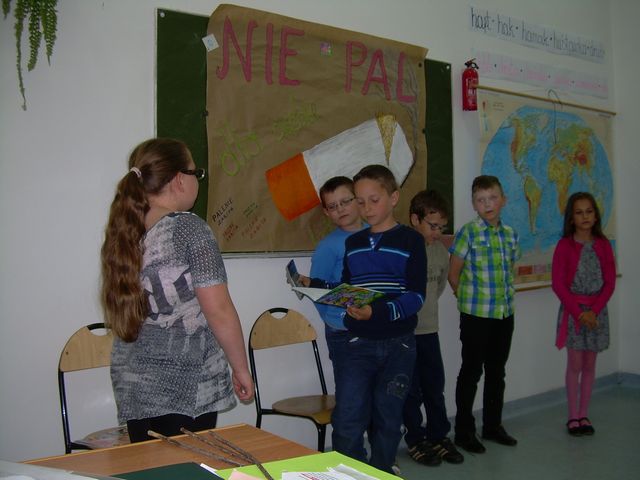 W II semestrze klasa II realizowała program profilaktyczny „Nie pal przy mnie, proszę”. Program ma charakter profilaktyczny, ale przede wszystkim ma na celu wykształcenie u dzieci świadomej umiejętności radzenia sobie w sytuacjach, w których inne osoby palą przy nich papierosy. Naszym przewodnikiem była wiewiórka Wiki. Podczas zajęć rozwiązywaliśmy rebusy, krzyżówki i zagadki. Były ciekawe zabawy, piosenki i kolorowanki. Łączyliśmy zabawę z nauką. Na zakończenie zajęć przygotowaliśmy występ artystyczny, który obejrzeli nasi rodzicem w dniu 14 maja 2015 roku. Mamy nadzieję, że przedstawienie się podobało.