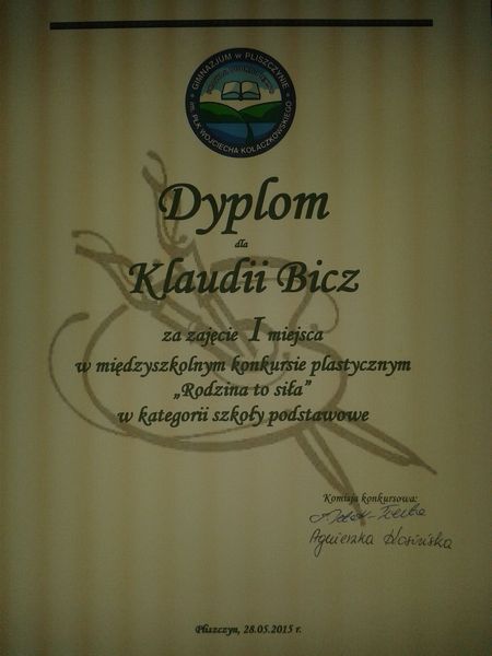 I MIEJSCE – KLAUDIA BICZ w Międzyszkolnym Konkursie Plastycznym „Rodzina to siła” organizowanym przez Gimnazjum w Pliszczynie. Klaudia wykonała pracę w technice collage pod kierunkiem nauczyciela plastyki p. Agnieszki Kosińskiej.
