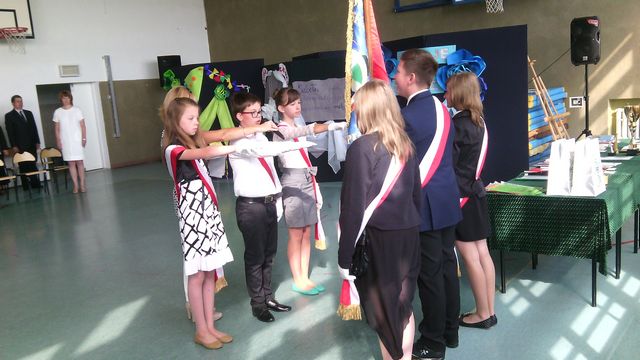 Podczas uroczystości nastąpiło także przekazanie sztandaru szkoły przez uczniów najstarszej klasy - uczniom z klasy V. Poczet sztandarowy w składzie: chorąży Bartosz Jarzyna oraz asysta Monika Szewczyk i Aleksandra Jóźwik oddał symbol szkoły w ręce nowego pocztu sztandarowego w składzie: chorąży Remigiusz Podstawka oraz asysta Aleksandra Owczarczak i Patrycja Zawiślak. Dziękujemy uczniom klasy VI za godne reprezentowanie szkoły na wszystkich uroczystościach szkolnych i gminnych.