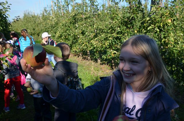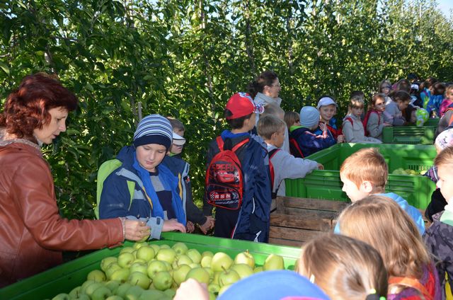 ,, wielką lodówkę\\\'\\\' czyli chłodnię, gdzie jabłka zimują. Obejrzeliśmy jak powstaje świeży sok bez cukru, konserwantów i wody. Wszyscy zostali poczęstowani przepysznym , cudownie pachnącym sokiem wytłoczonym w tradycyjnej prasie.Pobyt na świeżym powietrzu zaostrzył apetyty, wzięte ze sobą kanapki, popijane gorącą herbatą znikały w oka mgnieniu.Potem były zabawy w udostępnionym ogródku, wyścigi z jabłkiem i rzuty jabłkiem do celu.Humory nam dopisywały, ale czas było wracać.Zostaliśmy wychwaleni przez panią Elżbietę Buła , właścicielkę gospodarstwa, jako wspaniała grupa, za wiedzę o wsi i zachowanie oraz zaproszeni na wiosnę na plener, kiedy sad będzie kwitł. Z pewnością z zaproszenia skorzystamy.