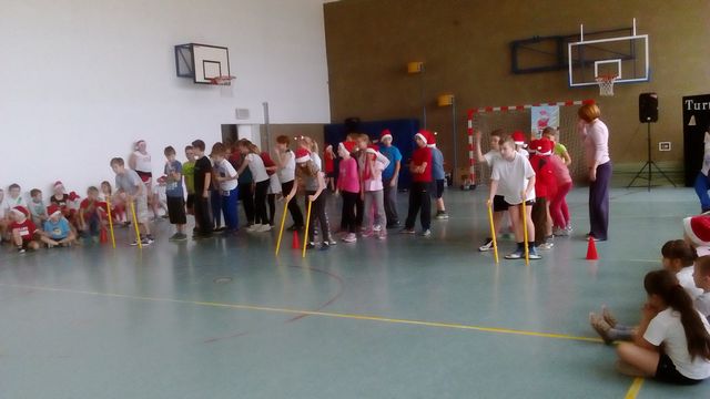 Zawodnicy w pełnej gotowości czekali na pierwszą konkurencję, którą było "roznoszenie prezentów" - należało przenieść worek z kolorowymi kuleczka do półmetka, tam wyjąć jedną ułożyć w kółku i biegiem wrócić do rzędu i przekazać worek następnej osobie. W tej konkurencji najlepsza była klasa V a z młodszych kl.II. natomiast opiekunowie musieli na sygnał wystartować, dobiec do półmetka i zebrać wszystkie kulki i wrócić na linię mety. Ale było przy tym zabawy, ho ho, ho :).......