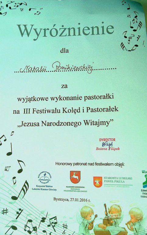 Dnia 27 stycznia 2016 roku zespół wokalny w składzie: Jagoda Buczek, Deborah Basso, Klaudia Ponikiewska, Remigiusz Podstawka, Klara Brańska oraz Klaudia Bicz reprezentował naszą szkołę na III Festiwalu Kolęd i Pastorałek „Jezusa narodzonego witajmy” w Bystrzycy zorganizowanym przez Specjalistyczny Ośrodek Szkolno-Wychowawczy. Honorowy patronat nad konkursem wokalnym objęli: Prezydent Miasta Lublina, Starosta Lubelski, Marszałek Województwa Lubelskiego oraz Wójt Gminy Wólka Pan Edwin Gortat. Zespół wykonał pastorałkę współczesną pt; „Święta, święta”, wprowadzając słuchaczy w niesamowity klimat narodzenia Pana. W kategorii solistów zaprezentowały się siostry Klaudia Ponikiewska w kolędzie „W żłobie leży” akompaniując sobie na gitarze klasycznej, zaś Natalka góralską kolędę „Oj , maluśki, maluśki” w stroju krakowskim. Uczennica otrzymała za swój występ wokalny wyróżnienie, oraz nagrody rzeczowe . Do występu artystycznego uczennicę przygotowała Pani Magdalena Boguszewska. Uczniowie za swój występ otrzymali pamiątkowe dyplomy, słodycze oraz statuetkę. Wszystkim bardzo serdecznie gratulujemy wspaniałych występów. Wszyscy spędziliśmy miło czas przy dźwiękach kolęd, śpiewając.