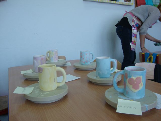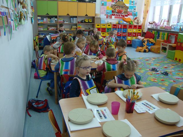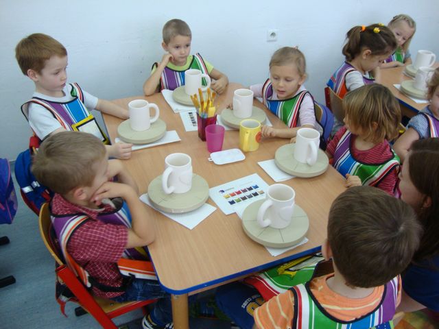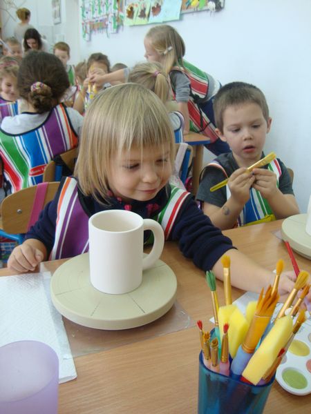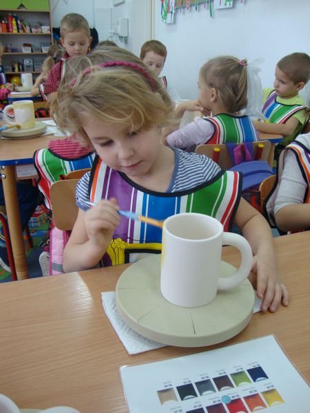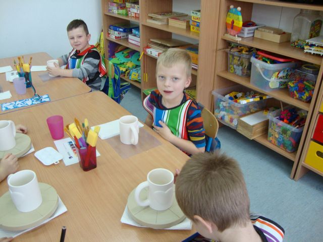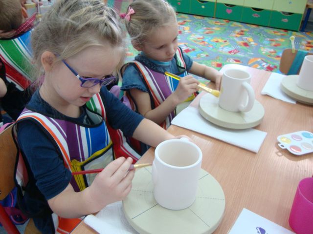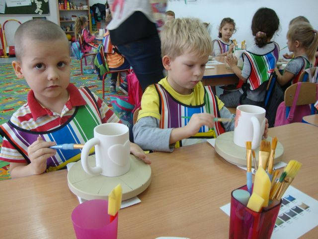 Nie od wczoraj wiadomo, że przedszkolaki uwielbiają wszelkiego rodzaju prace plastyczne. Poznając różne techniki i rozwijając swoją wyobraźnię, bawią się różnorodnymi materiałami. Tym razem na warsztat poszły... kubki. Ale, ale- nie myślcie sobie, że to takie zwykłe kubki. Jedyne i niepowtarzalne, ponieważ każde dziecko, dobierając ulubioną paletę kolorów, mogło wymalować kubek według własnego pomysłu. I tu się zaczęło: czy kropeczki, czy paseczki, czy jednokolorowe, czy wielobarwne... Niezwykłe, ponieważ po wymalowaniu przez przedszkolaki miały trafić do fabryki zabawek św. Mikołaja, gdzie jego elfy zajmą się wypaleniem tychże naczyń w magicznym, świątecznym piecu. I już? - zapytacie? Otóż nie, bo gdy już nadejdzie, ten najbardziej oczekiwany przez wszystkie dzieci dzień, św. Mikołaj nas odwiedzi i przywiezie nam nasze kubeczki. Czekamy z niecierpliwością!!! A Paniom z Dekoramiki, dziękujęmy za wzorcowe przeprowadzenie warsztatów ceramicznych.