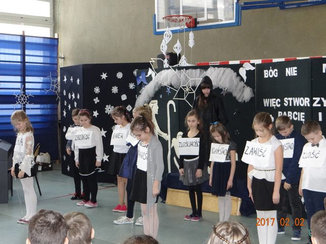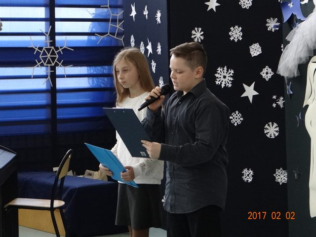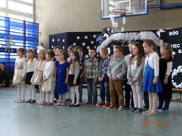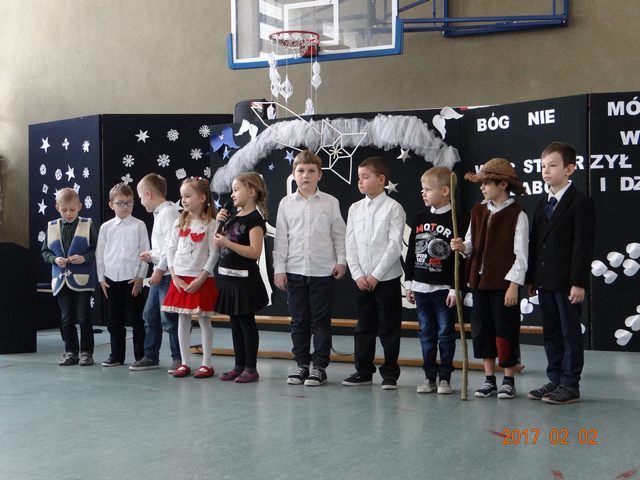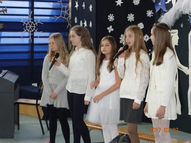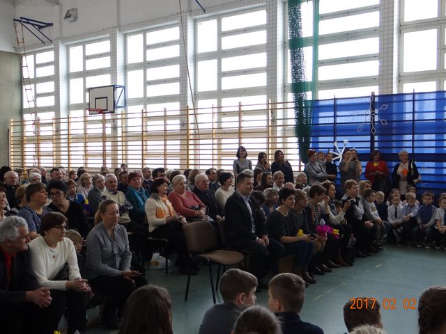 W dniu 2 lutego 2017 roku do szkoły zawitali zaproszeni przez wnuczki i wnuków Babcie i Dziadkowie. Było to wzruszające spotkanie z okazji ich Święta. W pięknej scenerii zimowej uczniowie zaprosili seniorów do wspólnego kolędowania. Każda klasa, począwszy od przedszkolaków aż do szóstoklasistów przygotowała kolędę. Niektórzy uczniowie grali na fletach, dzwonkach, gitarze, a nawet na pianinie. Były też wiersze i bardzo ciepłe życzenia. Uroczystość zaszczycił również wójt gminy Wólka pan Edwin Gortat, który przekazał podziękowania i życzenia seniorom. Uśmiechnięci Babcie i Dziadkowie otrzymali upominki wykonane własnoręcznie przez dzieci. Spotkanie zakończył wspólny słodki poczęstunek. Mamy nadzieję na kolejne takie spotkanie za rok!