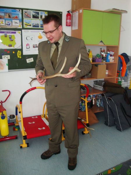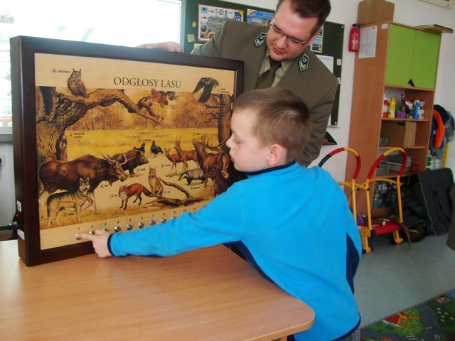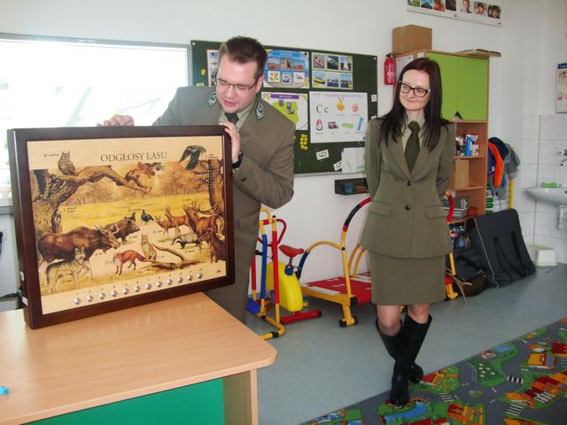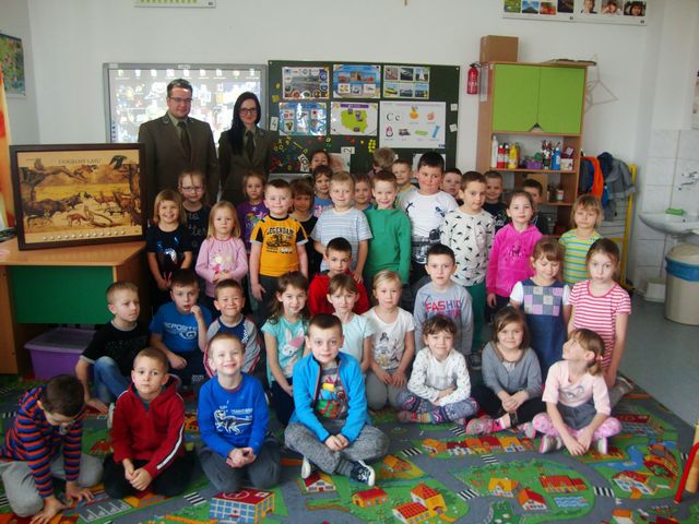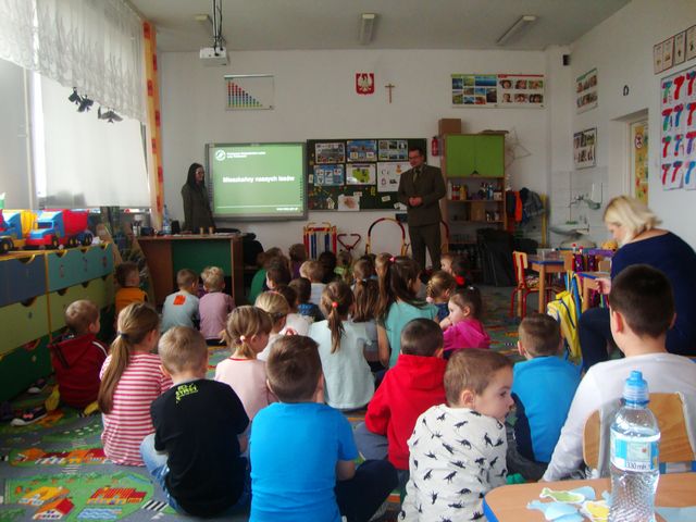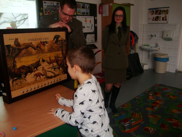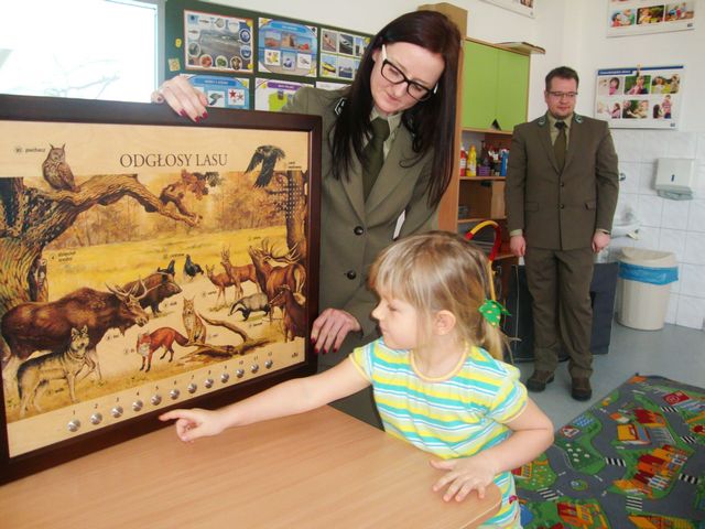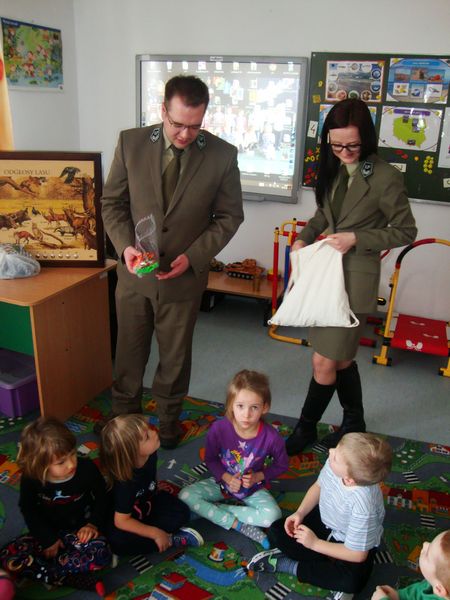 Wydawać by się mogło, że to jakieś indiańskie imiona, ale nic bardziej mylnego :) W czwartek 23 lutego, p. Ania i p. Paweł z Nadleśnictwa Lubartów, opowiadali przedszkolakom, kto to taki leśnik i na czym polega jego praca. Przypomnieliśmy sobie jak jest zbudowany las, utrwaliliśmy znanych i poznaliśmy nowych mieszkańców lasu, bawiliśmy się rozpoznając zwierzęta po wydawanych przez nie odgłosach. Dzieci z chęcia i zainteresowaniem odpowiadały na pytania i same pytania zadawały. Na koniec każdy z uczestników spotkania dostał medal, odblask i oczywiście cukierki :)) Kto by pomyślał, że borsuk chichocze, a sarny "szczekają" i poroże mają?...
