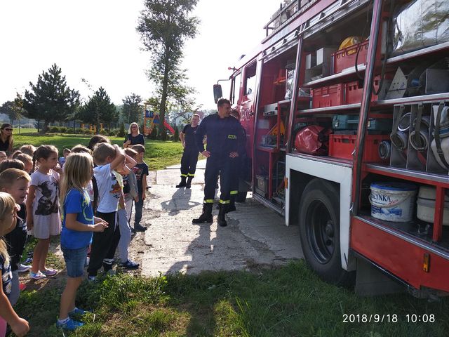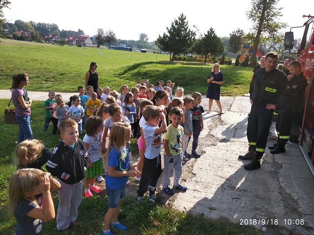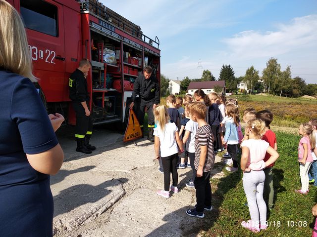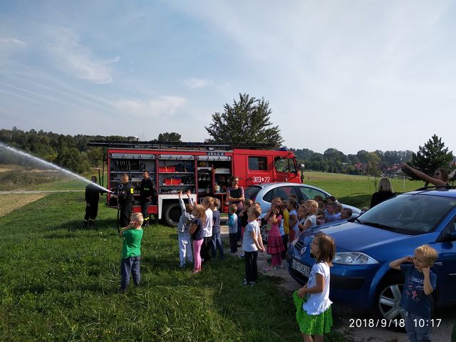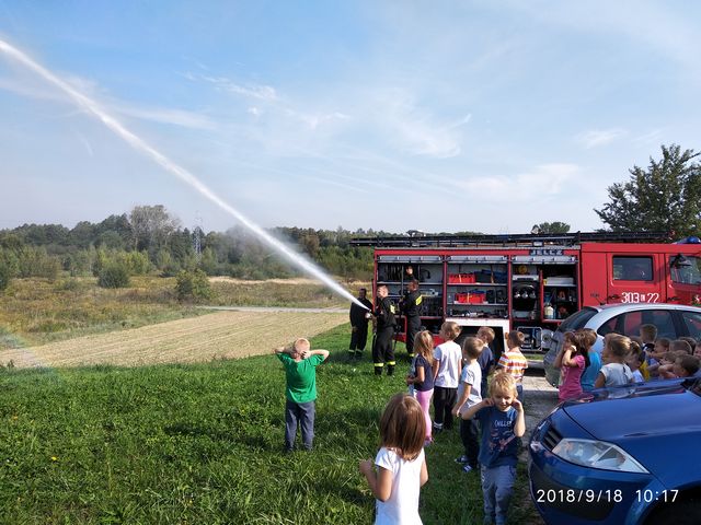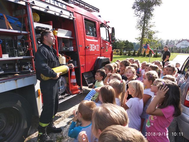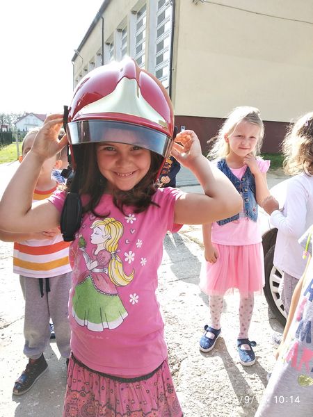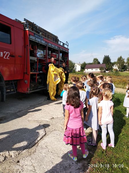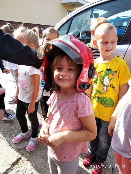Wczoraj przedszkolaki skorzystały z okazji i spotkały się ze strażakami z Jednostki Ratowniczo- Gaśniczej nr 3 KM Pańswowej Straży Pożarnej w Lublinie. Jak wiadomo prawie co drugi 6 latek chce w przyszłości zostać strażakiem... Dowiedzieliśmy się na czym polega praca strażaka, mieliśmy możliwość obejrzeć specjalnie oznakowany i przygotowany do udziału w akcjach ratowniczo- gaśniczych wóz strażacki. Czego tam nie było...Nosze, piły, szpadle, nożyce do cięcia metału, specjalne kombinezony, węże strażackie, no i oczywiście drabina. Kto chciał nakładał hełm strażacki, dużo było przy tym śmiechu, ale największy aplauz wzbudził pokaz lania wody z węża pożarniczego oraz sygnały dżwiękowe wozu.