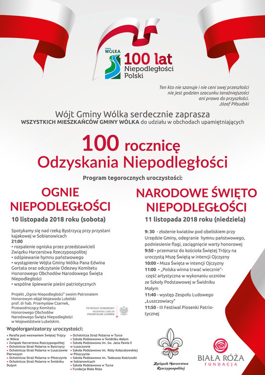 Wójt Gminy Wólka serdecznie zaprasza Mieszkańców Gminy Wólka do udziału w obchodach upamiętniających 100- letnią rocznicę Odzyskania Niepodległości.