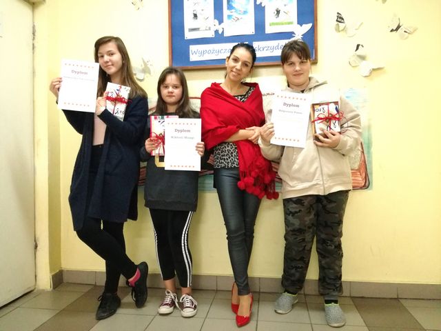 i Iwony Pietrzak Płachty ( po wcześniejszej weryfikacji poprawnych odpowiedzi przez bibliotekarza) wylosowała zwycięzców konkursu w poszczególnych kategoriach: