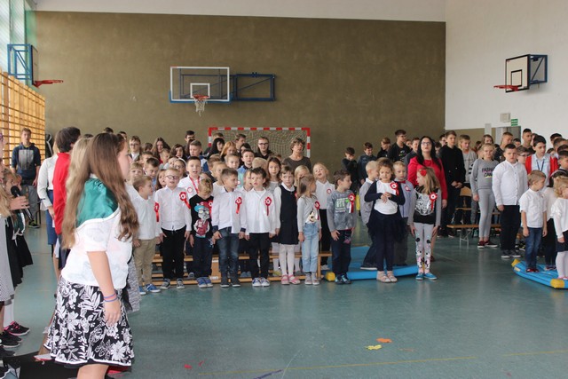 Chór pod kierunkiem p. Agnieszki Kosińskiej zakończył przedstawienie mocnym akcentem „Żeby Polska była Polską”, a widzowie nagrodzili aktorów burzliwą owacją. Pieśni legionowe pięknie zagrał Kuba Mrozik z kl. VI. Wsparcia aktorom udzieliły panie: E. Rola i E. Szewczyk. Artyści w kostiumach zaprezentowali się rewelacyjnie, a uroczystość z okazji 100 rocznicy odzyskania niepodległości przez Polskę stała się okazją do wyrażenia uczuć patriotycznych przez całą społeczność naszej szkoły. Wszyscy poczuli, że Polacy to jedna wielka rodzina…