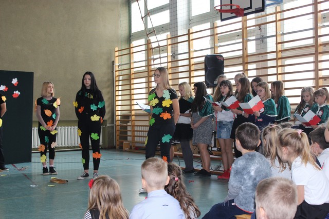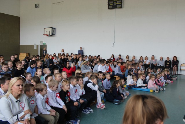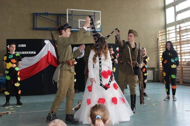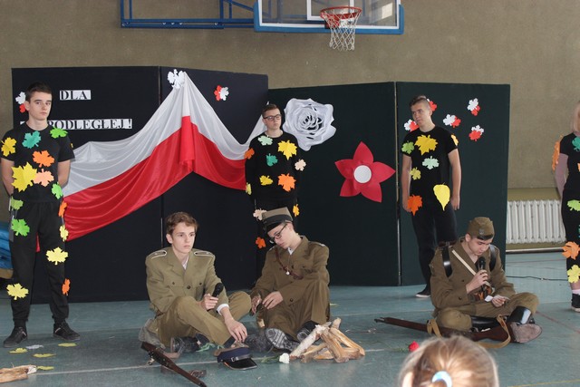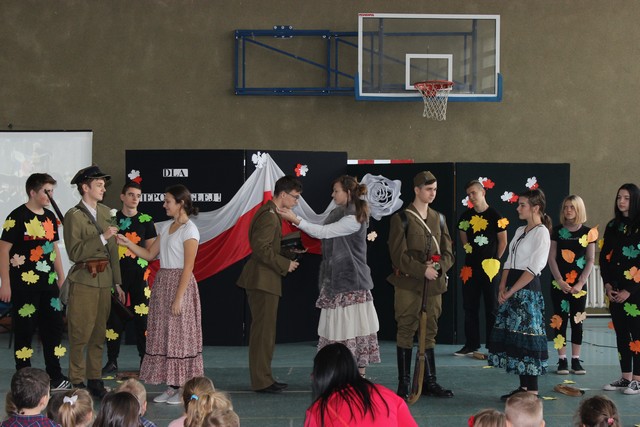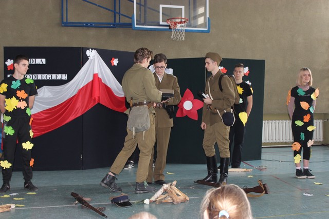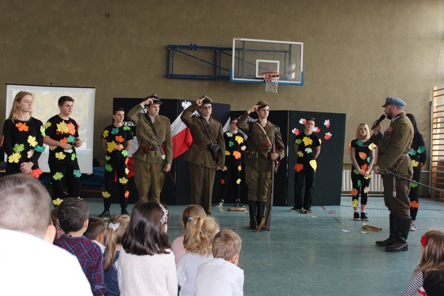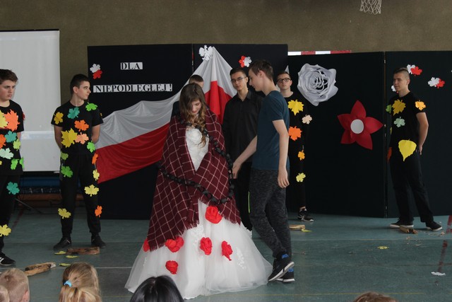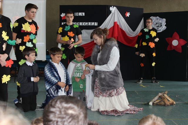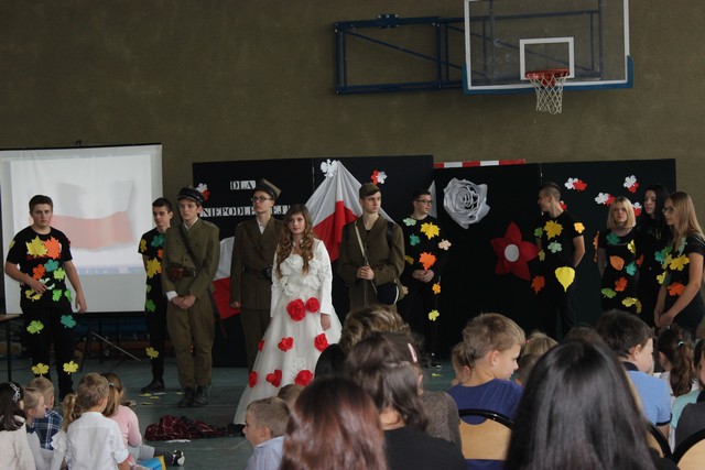 "Pamięta ziemia, niebo, las pamięta" – śpiewało drzewo drzewu o losach naszej Ojczyzny, gdy przez trzech zaborców była zagarnięta. Tak w naszej szkole rozpoczęło się widowisko z okazji 100 rocznicy odzyskania niepodległości przez Polskę. Na początku wszyscy odśpiewali hymn narodowy, a potem wystąpili uczniowie klasy III c gimnazjum pod kierunkiem p. Beaty Mazur- Wójtowicz. Pojawili się żołnierze, którzy żegnali się z bliskimi idąc w bój, a przemówił do nich sam Komendant Józef Piłsudski (niektórzy rozpoznali pod maciejówką ks. Mariusza Wrzesińskiego). Wszystkich wzruszyła scena pisania listów z frontu i modlitwy rodziny w intencji Ojczyzny.