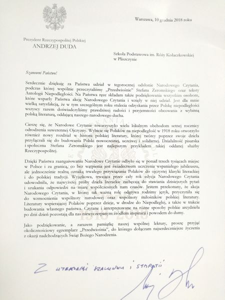 Jest to wyraz podziękowania za udział naszej szkoły w tegorocznej odsłonie Narodowego Czytania