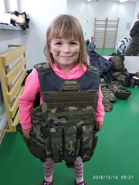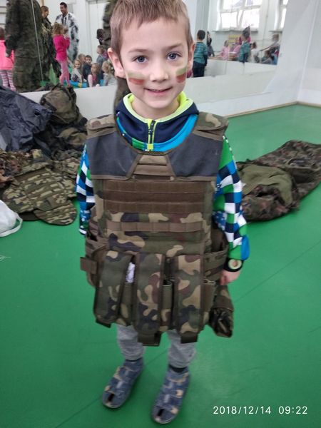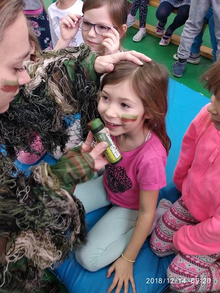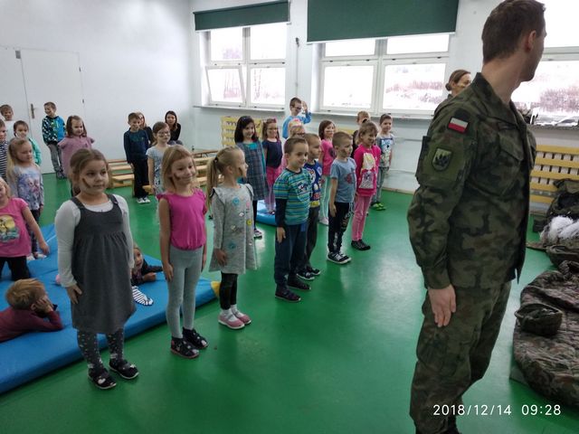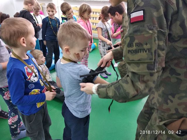 Wojsk Obrony Terytorialnej, potocznie zwanych terytorialsami. Już od pierwszych sekund dzieci były zdyscyplinowane jak na prawdziwego żołnierza tzn. przedszkolaka przystało. Uważnie słuchając, dowiedzieliśmy się czym rożni się życie „prawdziwego przedszkolaka” od życia „prawdziwego żołnierza”. Żołnierz : jeden mundur, jedna czapka, jedne buty, kamizelka, hełm, jeden bardzo ciężki plecak wyposażony codziennie w ten sam sposób, a przedszkolak: codziennie inne ubrania, czapka i buty dostosowane do pogody, a w plecaku może spotkać codziennie inne skarby. Dla żołnierza plecak jest najważniejszy. Jakie nosi w nim skarby? Karimata, śpiwór, menażka, lornetka… wszystkie najpotrzebniejsze rzeczy potrzebne do przetrwania. Wszyscy z podziwem słuchaliśmy o życiu dzielnych żołnierzy, dzieci mogły założyć niektóre części „garderoby”, obejrzeć z bliska wszystko to znajduje się w plecaku żołnierza. Mimo tych trudów jakie muszą znosić terytorialsi w sercu czują dumę a my patrząc na nich czujemy szacunek i podziw, dlatego też nie jeden przedszkolak chciałby być żołnierzem. Kto wie, może nim zostanie…
