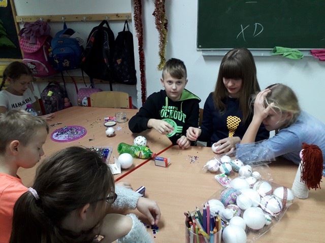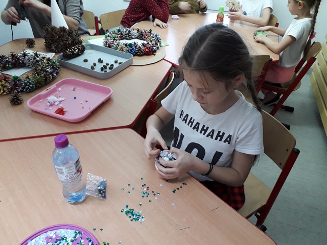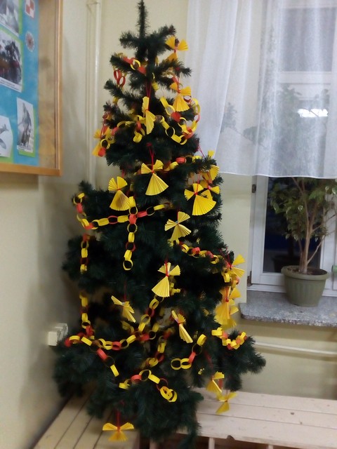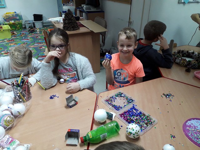 Grudzień dla uczniów chodzących na świetlicę był czasem wzmożonych działań, przygotowujących do dobrego przeżycia świąt Bożego Narodzenia. Z wielką gorliwością i dokładnością przygotowaliśmy ozdoby na kiermasz świąteczny i do dekoracji naszej sali i szkolnych korytarzy, dekorując choinki. Szczególną radość sprawiło nam przystrojenie choinki ze zrobionych przez nas żółtoczerwonych aniołów i łańcuchów. Wspólne kolędowanie otworzyło czas świętowania.