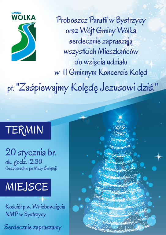 Proboszcz Parafii w Bystrzycy oraz Wójt Gminy Wólka serdecznie zapraszają wszystkich Mieszkańców do wzięcia udziału w II Gminnym Koncercie Kolęd pt.
