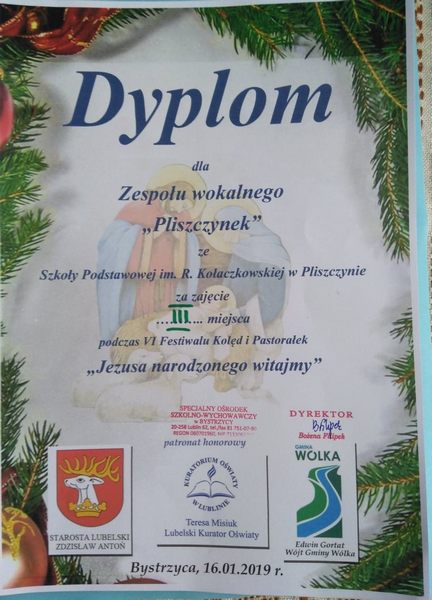16 stycznia 2019 już po raz szósty uczestniczyliśmy w Festiwalu Pieśni i Pastorałek „Jezusa narodzonego wszyscy witajmy” w Specjalnym Ośrodku Szkolno – Wychowawczym w Bystrzycy. Naszą szkołę reprezentował zespół wokalny Pliszczynek w składzie: Natalia Poniekiewska, Julia Żmuda, Małgosia Staszek, Małgosia Machaj, Tatiana Shkuratava, Ola Wilkoławska pod kierunkiem Pani Agnieszki Kosińskiej .Dziewczęta zaśpiewały wesołą pastorałkę „Jadą kolędnicy, jadą”, Wprowadziły wszystkich w niesamowity, klimatyczny nastrój, prezentując się w ciekawych strojach kolędniczych. Na 32 występujące podmioty wyśpiewały III miejsce!!!! Na koncercie panowała wspaniała atmosfera bliskości, integracji oraz wzajemnej życzliwości. Koncert rozpoczęliśmy wspólnym zaśpiewaniem kolędy „Jezusa narodzonego wszyscy witajmy”. Takie spotkania służą przede wszystkim promocji młodych talentów poprzez prezentację twórczości spotka artystycznej, kultywowanie tradycji bożonarodzeniowych oraz podtrzymywania tradycji wspólnego śpiewania kolęd i pastorałek. Koncert jeszcze na długo pozostanie w naszej pamięci. Wszystkim młodym artystom gratulujemy sukcesów i prosimy o więcej!