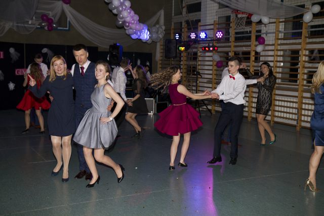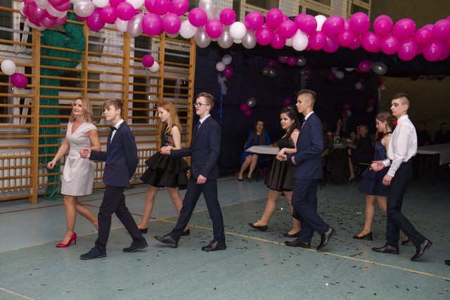 Po raz ostatni na balu karnawałowym bawili się uczniowie trzecich klas gimnazjalnych a po raz pierwszy uczniowie klasy VIII. Zabawa przygotowana przez Rodziców była pierwszym takim ważnym wydarzeniem, wprowadzającym młodzież w "dorosłe życie". Rozpoczęła się polonezem, ćwiczonym pod czujnym okiem p.Beaty Zinger i p. Jolanty Reszko. Dziewczęta i chłopcy, pięknie ubrani, przejęci i z poważnymi minami, bardzo ładnie zatańczyli ten tradycyjny taniec. Po przemowach pani dyrektor Elżbiety Purc i pana wójta Edwina Gortata wszyscy się odprężyli a muzyka puszczana przez DJ Strusia nie pozwoliła nikomu spokojnie siedzieć za stołem. Wszyscy doskonale się bawili, tańczyli aż do północy.