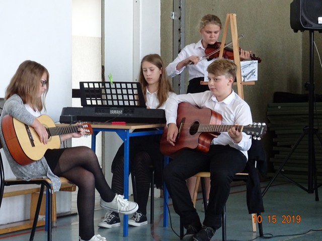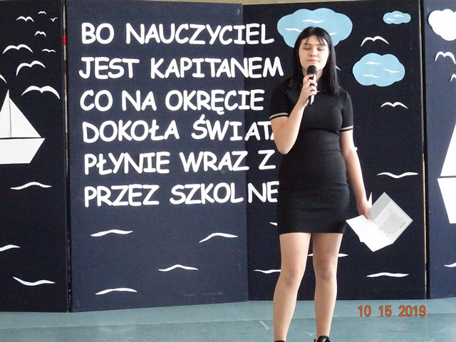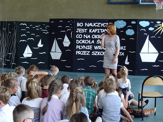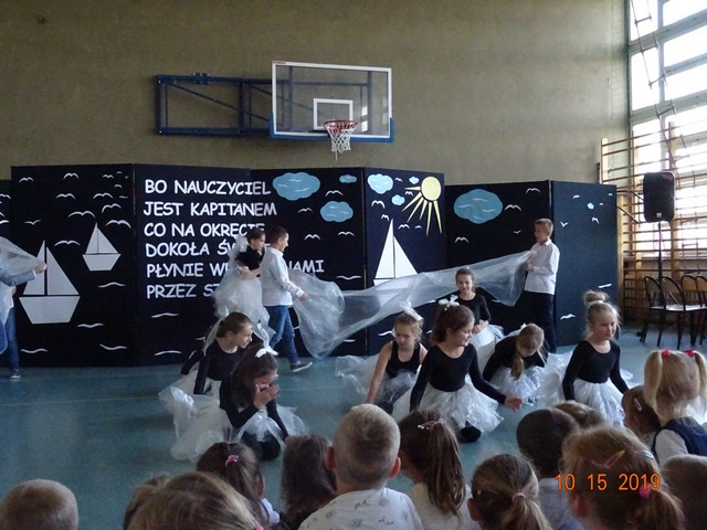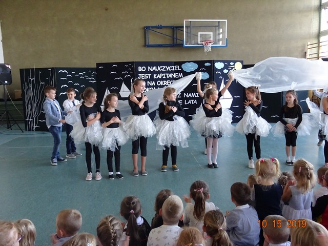 15 października Samorząd Uczniowski pod kierunkiem p. M. Podstawki przygotował podziękowanie i życzenia dla pracowników szkoły z okazji Dnia Edukacji Narodowej, pod tytułem: "Bo nauczyciel jest kapitanem co na okręcie dookoła świata płynie wraz nami przez szkolne lata". Wystąpił szkolny chór, przy akompaniamencie uczniów: Kacpra Tarłowskiego i Aleksandry Wilkołazkiej - gitary, Mai Piotrowicz - pianino, Amelki Jakubowskiej – skrzypce. Klasa ósma złożyła życzenia i przedstawiła humorystyczny program artystyczny. Uroczystość ubogacił taniec uczniów klasy trzeciej ze szkolnego teatrzyka "Pliszczynek". Nauczyciele i pracownicy otrzymali słodki prezent wdzięczności za trud i poświęcenie. Uczniowie zostali przygotowani przez p. A. Kosińską, p. M. Podstawkę i p. M. Boguszewską.