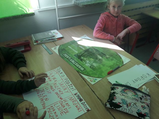 Kolejnym etapem było ustalenie grup, w skład których wchodzili uczniowie zajmujący się danym celem. Omówiliśmy działania poszczególnych grup i następnego dnia w środę wyposażeni w kosze, lupy i notatniki wybraliśmy się na wycieczkę do lasu.W czwartek pracując w wyznaczonych zespołach omówiliśmy wyznaczone wcześniej cele, czego efektem była korytarzowa wystawa. Podsumowaniem projektu był wtorkowy klasowy konkurs przyrodniczy oraz konkurs plastyczny pod wspólnym tytułem "Las bez tajemnic". Konkurs przyrodniczy przebiegał w dwóch etapach: