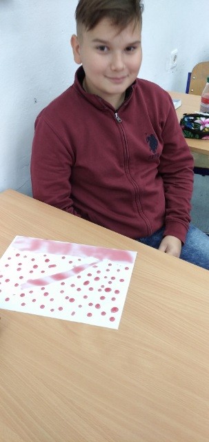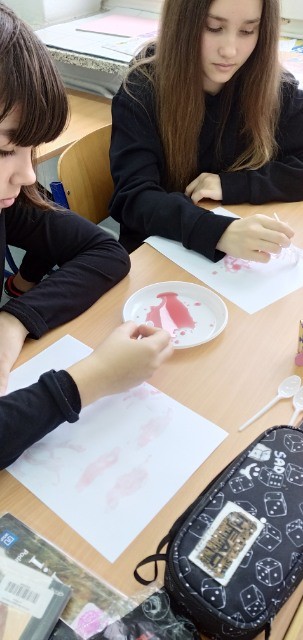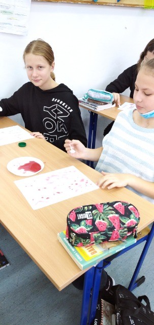 Czerwony płyn posłużył nam jednak do czegoś innego. Wsłuchani w tekst dramatu Juliusza Słowackiego, siódmoklasiści stworzyli prawdziwą galerię symboli kojarzących się z utworem. Pojawiły się: maliny, dzban, nóż, miejsce pierwszej zbrodni. Następnie uczniowie opisali swoje ilustracje.