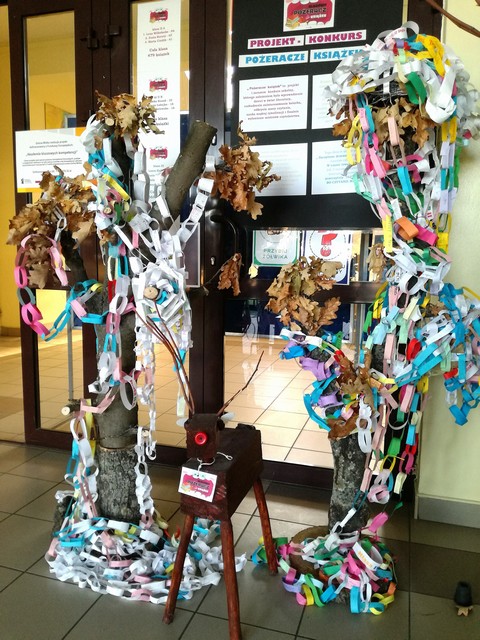 W holu pojawiły się „Zaczytane drzewa”, które wspólnie w łańcuchy naszego czytelnictwa ubraliśmy, a uczniowie z największym apetytem na literaturę odebrali zasłużone nagrody.