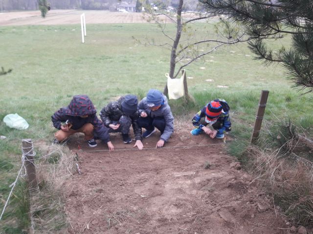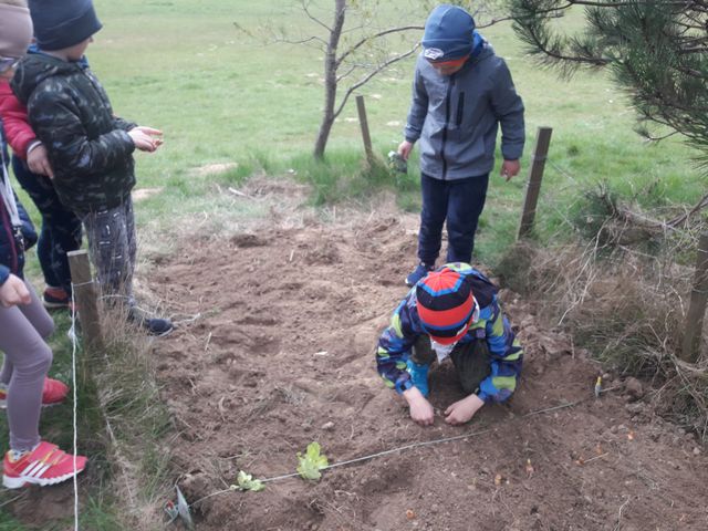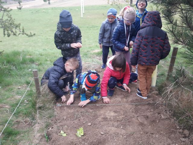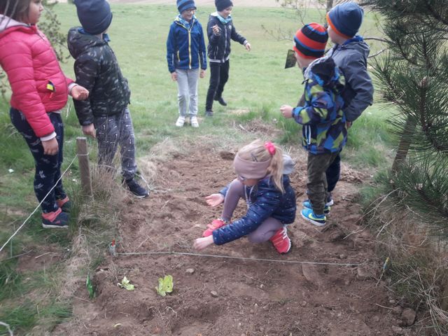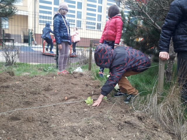 Uczniowie klasy pierwszej chcąc zdobyć wiedzę i umiejętności ogrodnicze założyli szkolny ogród warzywny. Wykonali prace przygotowujące ziemię do wysiewu i wyznaczali grządki.