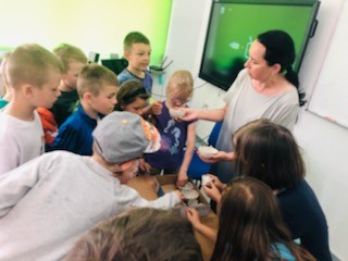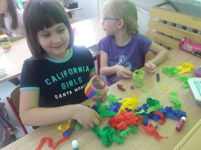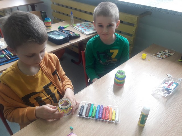 Tym razem gościem czytającym książkę była p. Monika Lichaczewska, która bardzo lubi w wolnym czasie wykonywać ozdoby świąteczne i domowe dekoracje artystyczne. Podczas zajęć uczniowie odkryli tajniki takich zawodów jak: garncarz, tkaczka, koronkarka. Bohaterowie książki zabrali uczniów do warsztatu garncarskiego i pokazali jak wieloma cechami muszą odznaczać się twórcy rękodzieła. Uwieńczeniem zajęć było oglądanie naczyń wykonanych z gliny oraz wykonanie wazoników na wiosenne kwiaty.