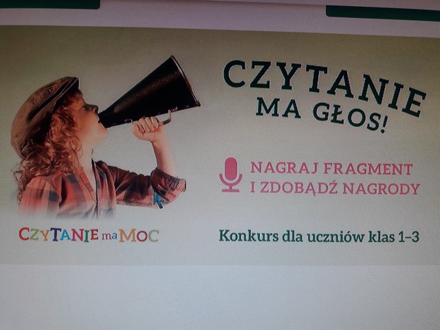 Moc czytania jest ogromna, dlatego uczniowie klasy pierwszej dali tej mocy głos biorąc udział w konkursie – „Czytanie ma głos!”. Konkurs polegał na zarejestrowaniu kilkuminutowego nagrania fragmentu książki czytanej przez uczniów, która była omawiana w pierwszej edycji projektu. Wybraliśmy ulubione wiersze z książki Pana Michała Rusinka pt. „Wiersze domowe”. Czytane teksty zostały wzbogacone przez uczniów dźwiękami związanymi z tekstem. Nagranie wykonali uczniowie kl. I uczęszczający na zajęcia rozwijające kreatywność. Z niecierpliwością czekamy na wyniki konkursu.