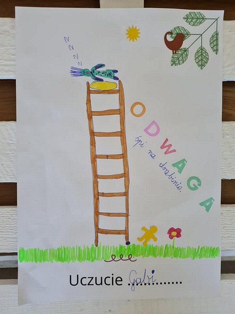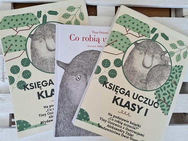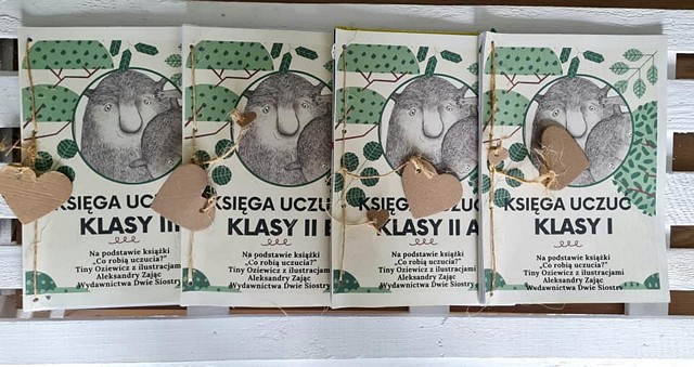 We wszystkich klasach nauczania początkowego odbyły się warsztaty z nią w roli głównej. Było oczywiście wspólne czytanie, uczuciowe kalambury i uczuciowa burza mózgów…ale było jeszcze COŚ wyjątkowego. Powstały KSIĄŻKI – a konkretnie KSIĘGI UCZUĆ poszczególnych klas. Te książki, jak na każdą porządną książkę przystało, miały swoją szatę graficzną, specjalnie zaprojektowane okładki (nawiązujące graficznie do oryginalnej publikacji), nazwę wydawnictwa i rok wydania, a nawet logo Wypożyczalni Skrzydeł ujęte w projekcie okładki.