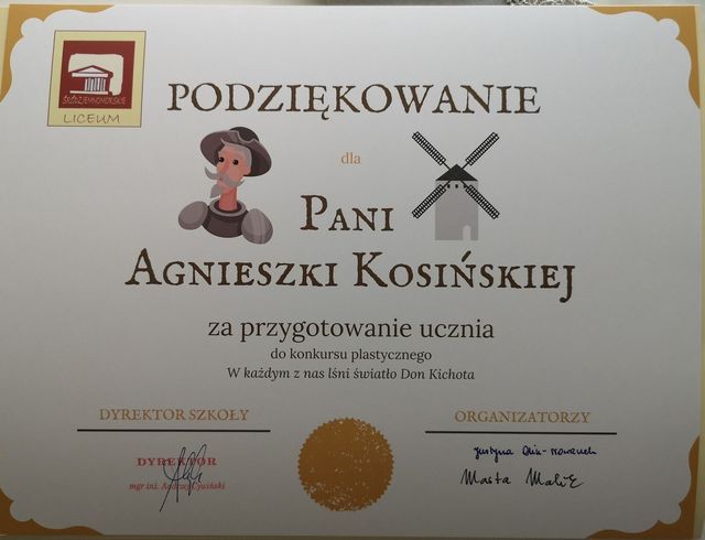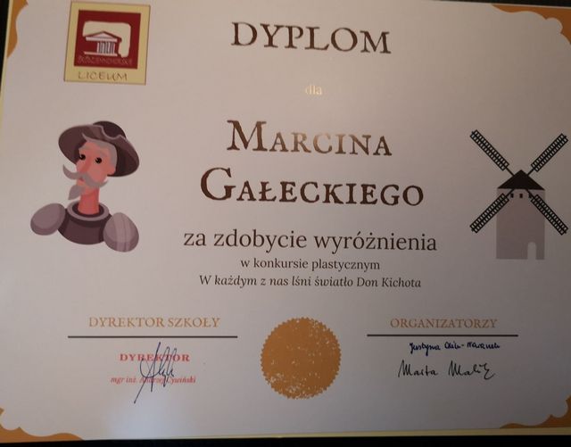 Gratulacje dla Marcina Gałeckiego, ucznia klasy 7, który wykonał pracę plastyczną na temat „W każdym z nas tkwi źródło Don Kichota” . Konkurs plastyczny organizowany był przez Liceum Śródziemnomorskie w Lublinie, w którym Marcin otrzymał WYRÓŻNIENIE. Opiekunem artystycznym była pani Agnieszka Kosińska.