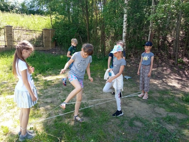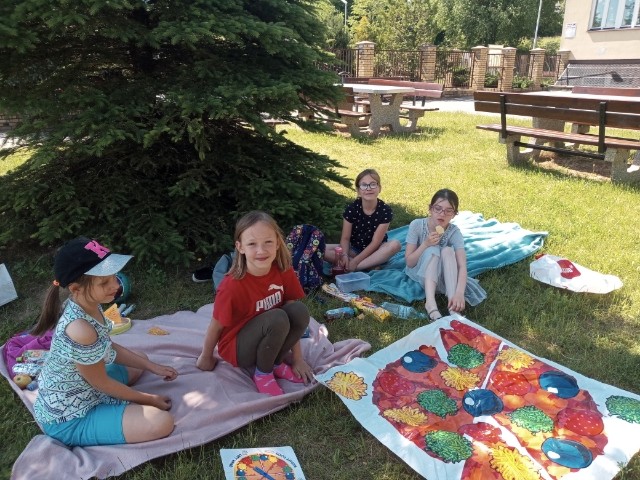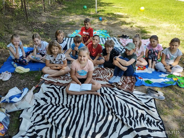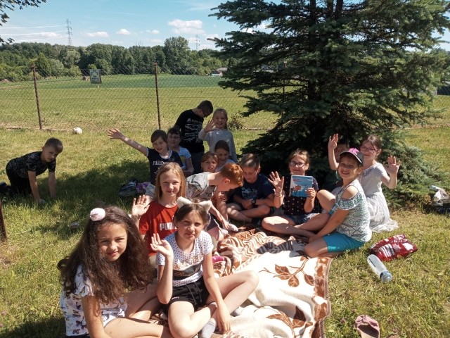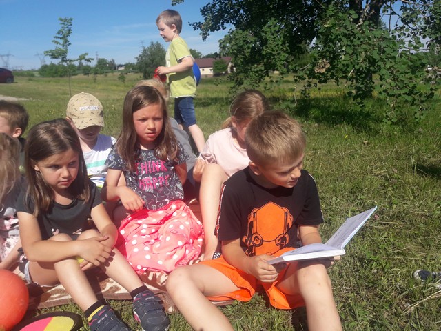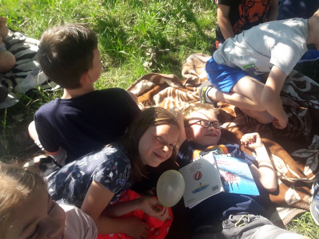 Najpierw czytała kl. I, która pozostawiła na kocu książkę dla kl. II A. Ta natomiast po przeczytaniu zostawiła lekturę rówieśnikom z kl. II B. Na zakończenie książka czekała na uczniów kl. III. Czytaniu towarzyszyły wakacyjne zabawy i gry. Mamy nadzieję, że „uwolniona” dzisiaj lektura będzie inspiracją czytelniczą na wakacyjne dni.