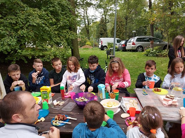 Uczniowie kl. IV, V,VI udali się na wycieczkę do Kazimierza Dolnego. Mieli okazję poznać bliżej bogatą historię miasta podczas spaceru malowniczymi uliczkami. Interesującym miejscem na mapie Kazimierza Dolnego był Kirkut - Cmentarz Żydowski. Uczniowie uczestniczyli w rejsie statkiem, podczas którego mieli szansę podziwiać nadwiślańskie widoki. Fascynującym punktem wycieczki był spacer przez Wąwóz Korzeniowy Dół. Uczniowie mogli z bliska obserwować rozwiniętą sieć odsłoniętych korzeni i pni starych drzew. Kulminacyjnym punktem programu wycieczki było ognisko, podczas którego dzieci integrowały się między sobą poprzez wspólne zabawy i rozmowy. Wszystkim uczestnikom dopisywały humory, a uśmiech szczęścia nie znikał z twarzy jeszcze na długo po powrocie do szkoły. Uczniowie kl. VII natomiast celebrowali szczęście podczas spotkania klasowego w parku przyklasztornym Księży Sercanów. Atrakcją było ognisko, zabawa w podchody o tematyce “Zadbaj o klimat na terenie klasztoru i przyległego terenu”. Dzieci były podzielone na dwie grupy, do której przydzielone były dwie osoby dorosłe, zarówno wychowawca klasy, jak i rodzice. Jedna i druga drużyna przebyła trasę w czasie 1,5 godz. przy okazji ucząc się jak np. oszczędzać energię. Sport to zdrowie, a zdrowie to szczęście, dlatego nie zabrakło gry w piłkę i zabawy w chowanego. Spotkanie przebiegło w miłej atmosferze, zarówno pogłębiającej wiedzę, jak i integracyjnej. Uczennice z klasy ósmej na zajęciach z j.hiszpańskiego pisały oczywiście po hiszpańsku tekst “Kiedy jesteśmy szczęśliwe?” (estoy feliz/alegre cuando...).