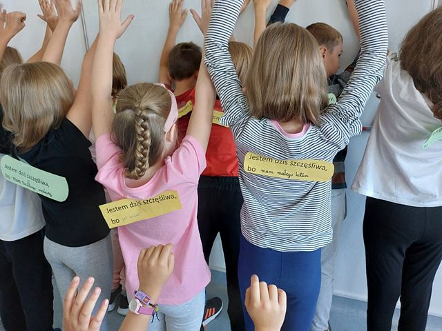 Nasza szkoła aktywnie uczestniczyła w II Ogólnopolskim Tygodniu Szczęścia w Szkole, który w tym roku obchodziliśmy 20- 26 września. Pomysł świętowania wywodzi się z Międzynarodowego Tygodnia Szczęścia w Pracy, obchodzonego w tym samym czasie. Z prowadzonych badań wynika, że szczęśliwi ludzie żyją dłużej i zdrowiej, są bardziej odporni i kreatywni, zaangażowani w działania oraz chętniej budują przyjacielskie relacje. Na te dni przygotowaliśmy wyjątkowe aktywności, które pozwoliły lepiej zrozumieć cel święta . Działania miały pokazać, że szczęście i dobrostan wpływają na zwiększenie możliwości każdego z nas, co ma istotny wpływ na efekty kształcenia. Wyrażaliśmy szczęście na różne sposoby. Biblioteka szkolna włączyła się w obchody święta organizując dla wszystkich klas w szkole, warsztaty z książką pt. " Pięciu nieudanych" -Beatrice Alemangi.Uczniowie uczyli się jak zamieniać swoje niedoskonałości w zalety i odkrywali, że każdy z nas ma w sobie potencjał. Trzeba go tylko odnaleźć. Finalnym efektem warsztatów były KREATYWNE SKRZYDŁA naszych Supermocy, które powstawały podczas warsztatów i zdobią jedną ze ścian szkoły. Uczniowie kl. I-III każdego dnia tygodnia radośnie przeżywali aktywności wyrażone w następujących hasłach: