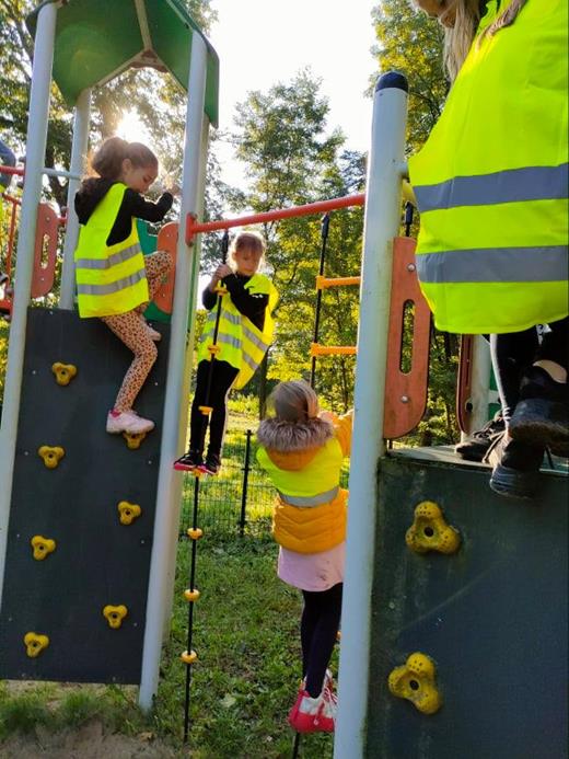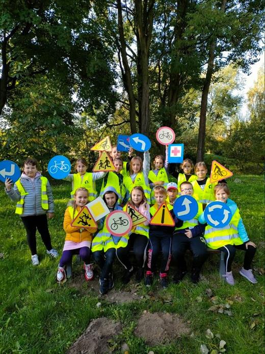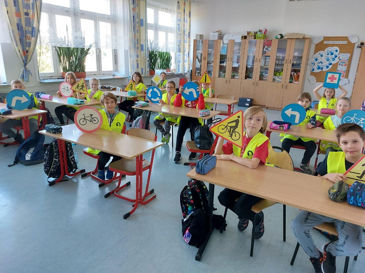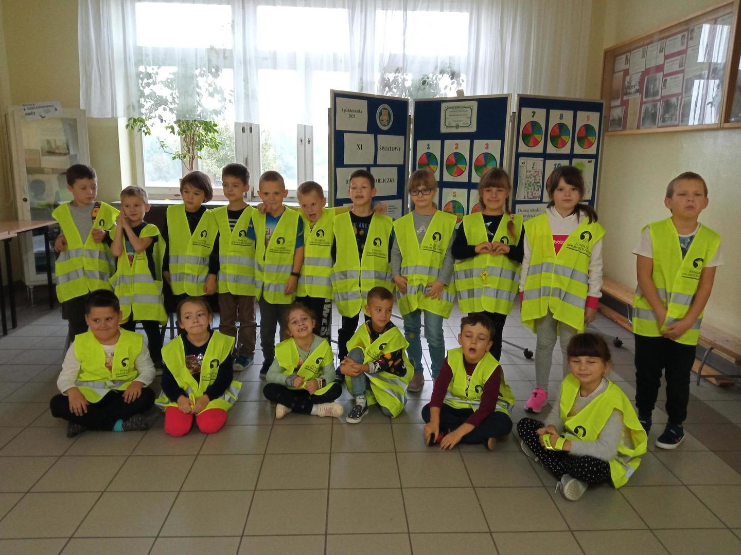 z rodzicem podejmują aktywność tematycznie związaną z lekcją.Materiały edukacyjne, które zostały przekazane od organizatorów stanowiły bazę dydaktyczną. Dodatkowo każdy uczeń dostał kamizelkę odblaskową.