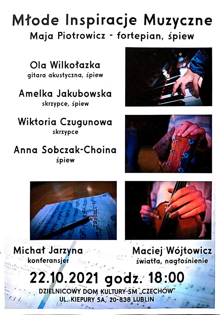 W dniu 22.10.2021r. o godz.18:00 w Dzielnicowym Domu Kultury SM „Czechów” odbędzie się koncert „Młode Inspiracje Muzyczne”.