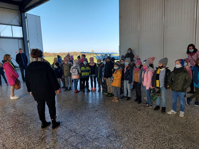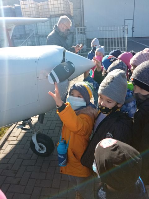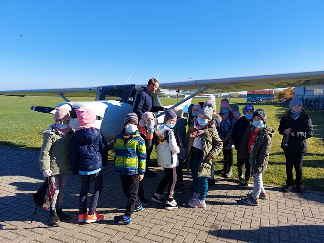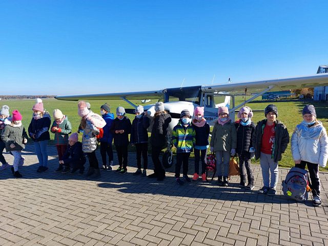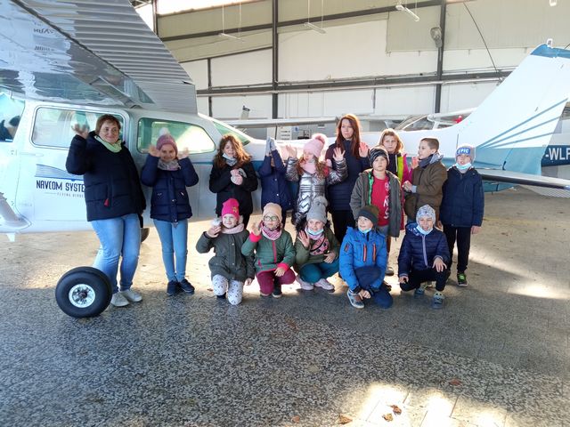 Szczęście mam dopisywało. Mogliśmy w trakcie naszego pobytu obserwować loty szkoleniowe, a także start samolotu pasażerskiego na pobliskim pasie jak i lądowanie wojskowego samolotu. Jakby tego było mało uczniowie podziwiali również lot helikoptera. Emocje towarzyszyły dzieciom przez cały pobyt. Na zakończenie otrzymały one drobiazgi od Pani Prezes na pamiątkę.