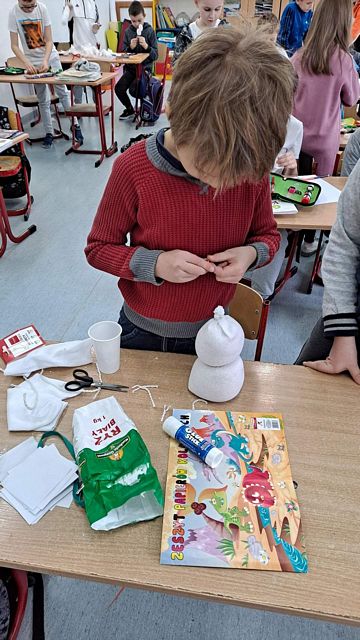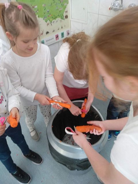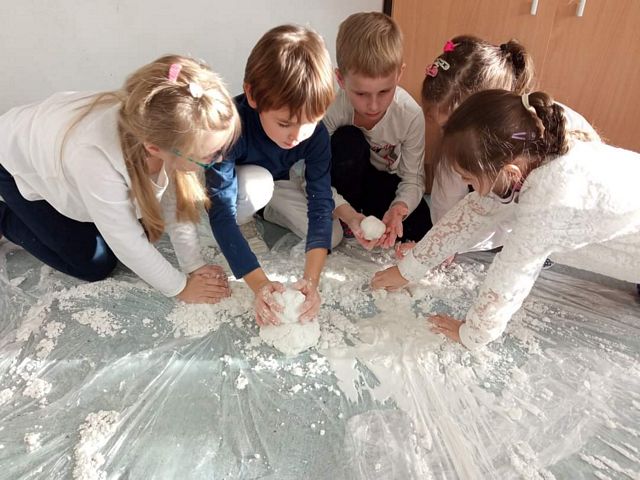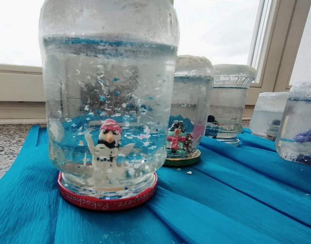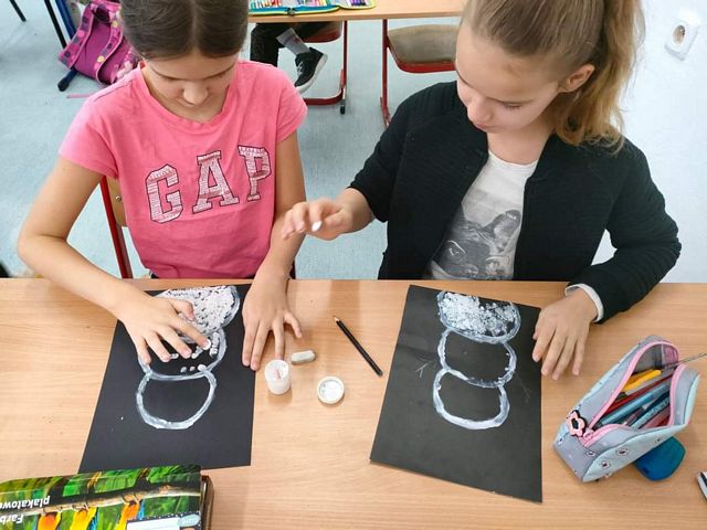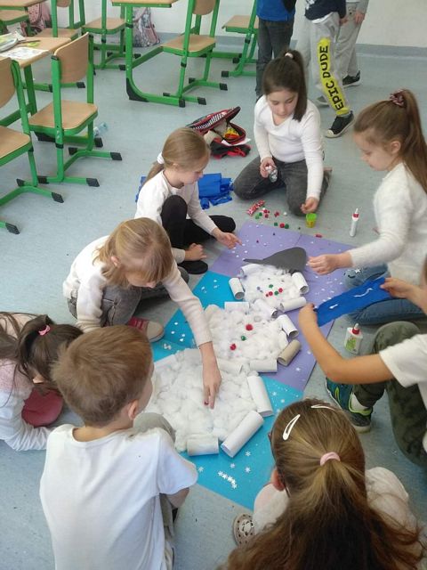 W dniu dzisiejszym, było niewiele śniegu i nie udało nam się ulepić bałwana. Jednak od czego jest wyobraźnia ? Dzieci ubrane w większości na biało różnymi technikami tworzyły bohaterów dzisiejszego dnia. Powstały bałwanki skarpetkowe ,talerzykowe, kubkowe ,rolkowe, butelkowe. Były naklejane, odbijane, brokatowe, zwijane i malowane, a nawet zamknięte w słoikach. Zarówno robione indywidualne jak i grupowo. Przy okazji bałwankowego tematu omówiliśmy bezpieczeństwo zabaw zimowych i wartości zdrowotne warzyw( na przykładzie marchewki). Omówiliśmy olimpijskie sporty zimowe. Ustaliliśmy skąd się bierze śnieg, jak powstaje i dlaczego znika. Jedna z klas nawet zrobiła własny sztuczny śnieg i lepiła z niego śnieżki i bałwany. Dzisiejszy dzień gromadził sympatyków śnieżnych bałwanów we wspólnym działaniu. Teraz tylko czekamy na śnieg żeby ulepić tego najprawdziwszego