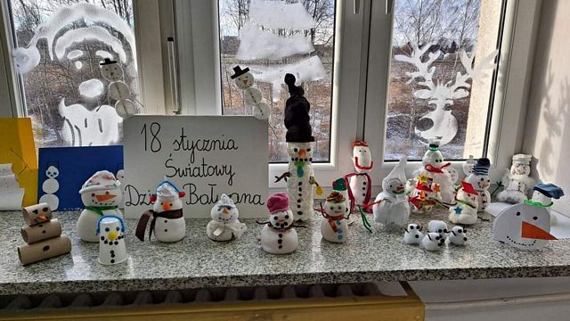 Uczniowie klas I-III w dniu 18 stycznia obchodzili Światowy Dzień Bałwana. Dlaczego akurat tego dnia? Wyjaśnienie jest dość zabawne: cyfra „8” przypomina kształtem bałwanka, a cyfra ”1” symbolizuje wetkniętą w niego miotłę lub patyk. Jest to nietypowe święto styczniowe, ponieważ miesiąc ten jest najzimniejszym miesiącem, w którym zwykle jest śnieg i można lepić bałwana.