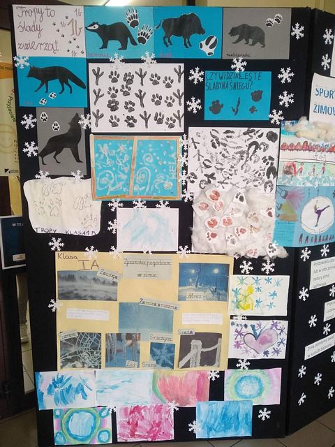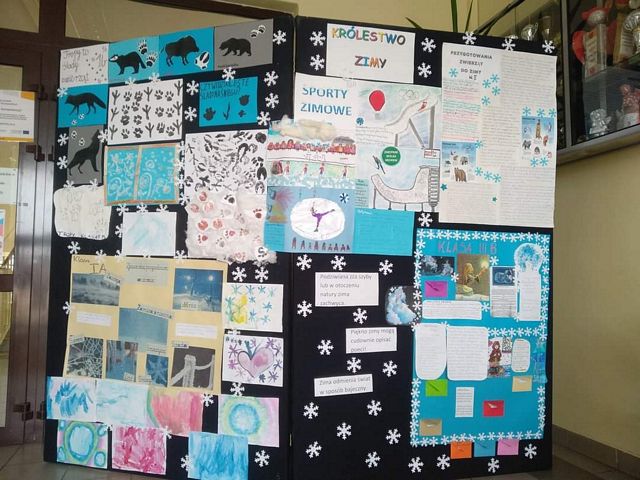 Uczniowie kl. I-III zakończyli pracę nad wspólnym projektem edukacyjnym pt. "Królestwo zimy". Dzieci z poszczególnych klas podzieliły się zadaniami, których opracowanie zostało wyeksponowane na wystawie korytarzowej. Zadania przedstawiały się następująco: