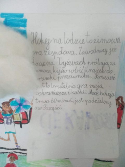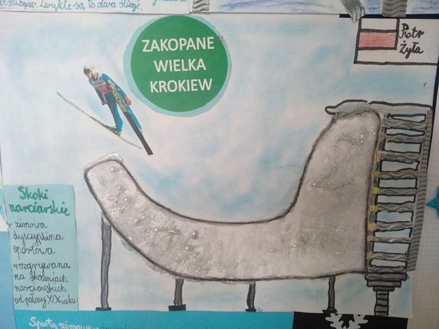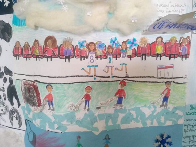 Kl.3a Zimowe dyscypliny sportowe. Uczniowie wykonali plakat obrazujący różnorodność zimowych sportów. Zachęcali do aktywności fizycznej ze zwróceniem uwagi na zasady bezpieczeństwa.