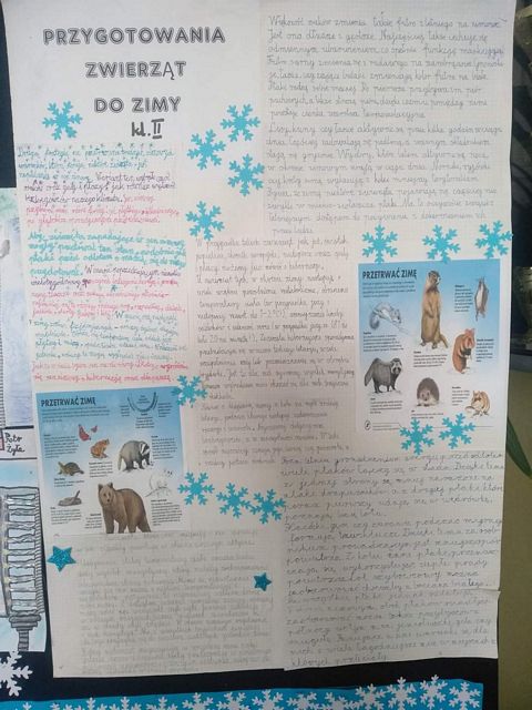 kl.2 Przygotowanie zwierząt do zimy. Uczniowie w ramach bloku tematycznego 'Mieszkanko na zimę" ustalili sposoby na przetrwanie i zimowanie różnych zwierząt. Czytali i omawiali opowiadania " O tym jak Żywija komórki do wynajęcia szukała" oraz "Idzie zima chudy nie przetrzyma". Wspólnie redagowali notatki informacyjne i przygotowali plakat związany z tematem zadania.