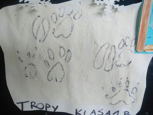 Kl.Ib - Tropy zwierząt. Uczniowie stemplowali tropy z pieczątek ziemniaka, przyklejali wycięte tropy na watę i rysowali tropy patyczkami na mące z klejem. Wspólnie przygotowali sylwety najpopularniejszych zwierząt naszych lasów z tropami. Pięknie ozdobili również klasowe okna "malując je mrozem".