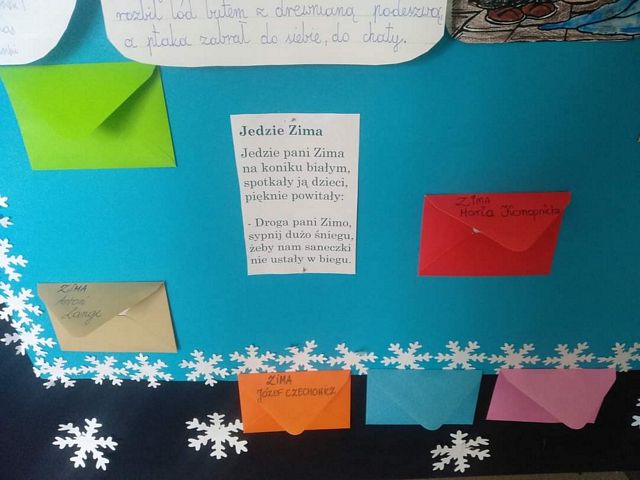 Kl.3b Zima w literaturze. Dzieci zapoznały się z literaturą o tematyce zimowej. Wykonały plakat z wierszami polskich poetów o zimie oraz wybranych fragmentów z innej literatury. Powstały bardzo ciekawe opisy zimy.