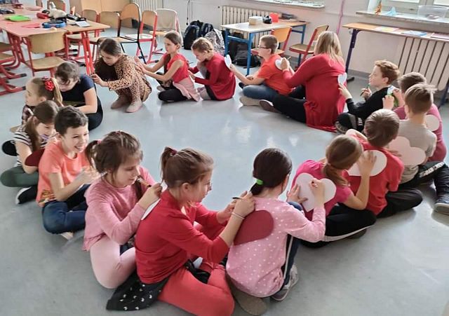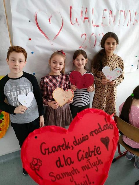 Co słychać?Bicie serca słychać...i śmiech,nasz walentynkowy film był tylko jednym z wielu działań jakie podjęliśmy w piątek w klasach 1-3.Jak wiecie nazwa tego święta pochodzi od imienia kapłana, który oddał życie za miłość.To, że Walentynki rozprzestrzeniły sie na cały świat, jest z kolei zasługą brytyjskiego pisarza i poety sir Waltera Scotta. W Anglii także w XVI w.została wysłana pierwsza walentynkowa kartka. Dziś najhuczniej są obchodzone w Stanach Zjednoczonych,tam popularne jest wysyłanie kartek i oglądanie romantycznych filmów. We Francji wysyła sie bukiety czerwonych róż. W Czechach zakochani tłumnie przybywają na most Karola w Pradze,gdzie zawieszają kłódki mające być gwarancją wiecznej miłości. W Japonii to kobiety obdarowują mężczyzn prezentami...A tak z ciekwostek to relikwie świętego Walentego przechowywane są również m.in. w Lublinie, ale wróćmy do Pliszczyna... Serc było wiele, były malowane,wycinane,ozdabiane,nadmuchiwane...na sercach pisały dzieci dobre słowa i życzliwe myśli kierowane do koleżanek, kolegów i przyjaciół,kto nie umiał słowem wyrazić pozytywnych uczuć, robił to gestem lub rysunkiem...na tablicach wirtualnie rozwiązywaliśmy zadania miłosne, emisariusze walentynkowej poczty roznosili kartki. Były kamienie przyjaźni, były butelki z miłosnymi listami dla rodziców, zresztą zobaczcie sami...