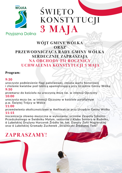 Wójt gminy Wólka oraz Przewodnicząca Rady Gminy Wólka serdecznie zapraszają mieszkańców Gminy na uroczyste obchody rocznicy uchwalenia Konstytucji 3 Maja, które odbędą się 3 maja 2022 r. w Jakubowicach Murowanych.