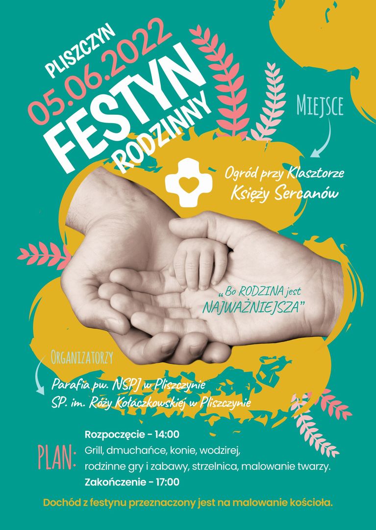 Serdecznie zapraszamy wszystkie dzieci i rodziców na festyn rodzinny organizowany z okazji dnia dziecka. Odbędzie się on w ogrodzie przyklasztornym w Pliszczynie w niedzielę 05.06.2022. Myślą przewodnią jest hasło: "Bo rodzina jest najważniejsza"